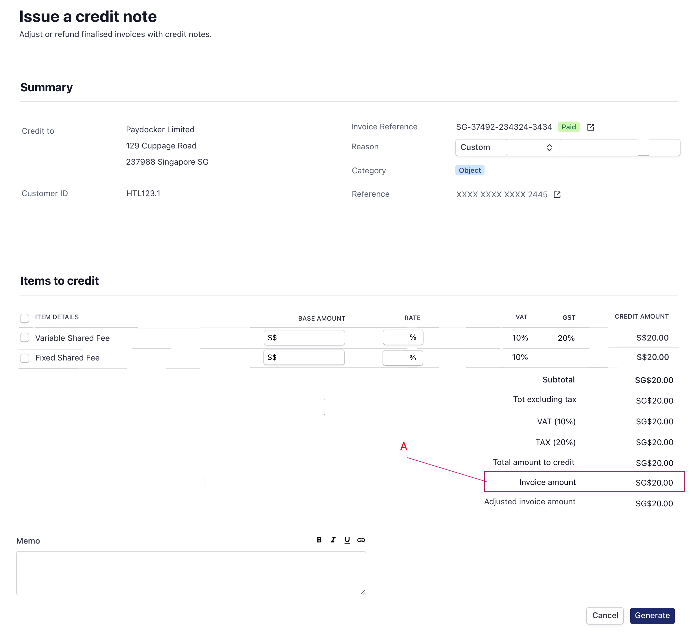 Each credit note receives a unique tracking number and will be visible under the Invoices and Events sub-sections. The credit note will also have automatically generated fields, based on your invoice detail. These generated fields are not editable.