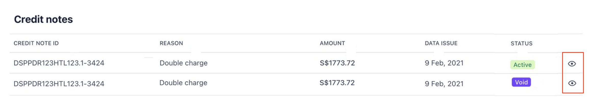 2. Scroll down to the Credit Note section. This will be the collated list of credit notes related to the invoices. At one glance, you will be able to see key information like Reason for issue, amount and status of credit notes.