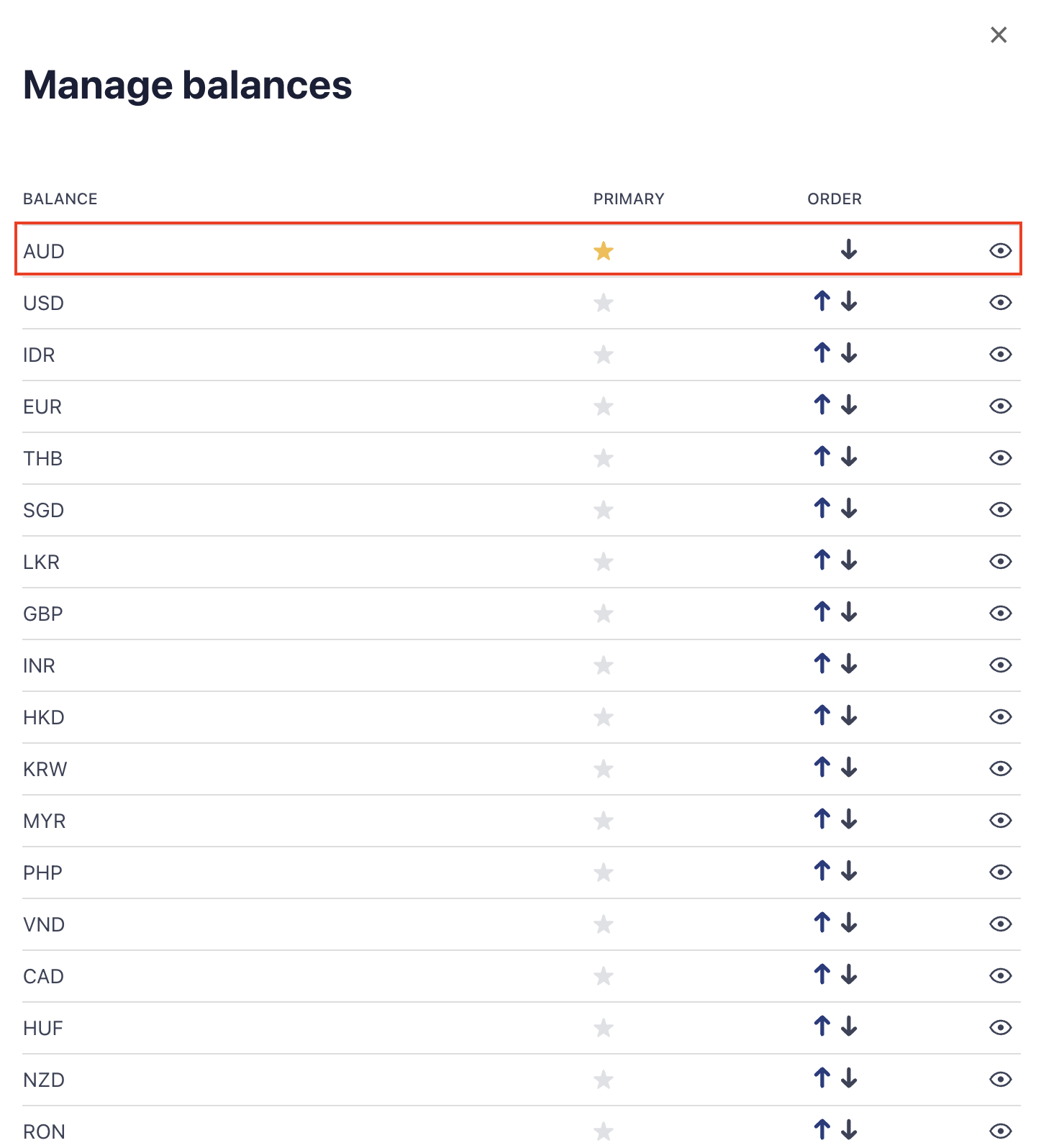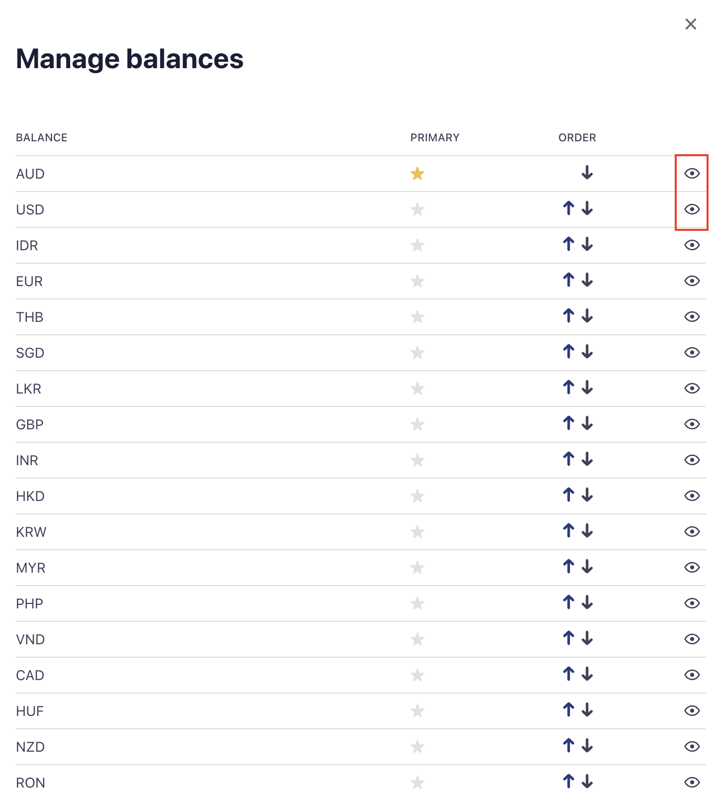 Use the eye icon to quickly access the information for each currency.
