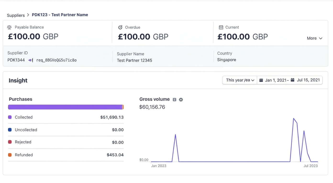 This dashboard provides a comprehensive overview of all your suppliers. It is designed to help you track your payments and monitor your cash flow at a glance.