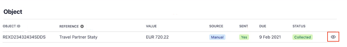 Click on the eye icon to open the full Manage Object page in a new tab within the same window, allowing you to view or manage the Object without leaving the invoice.